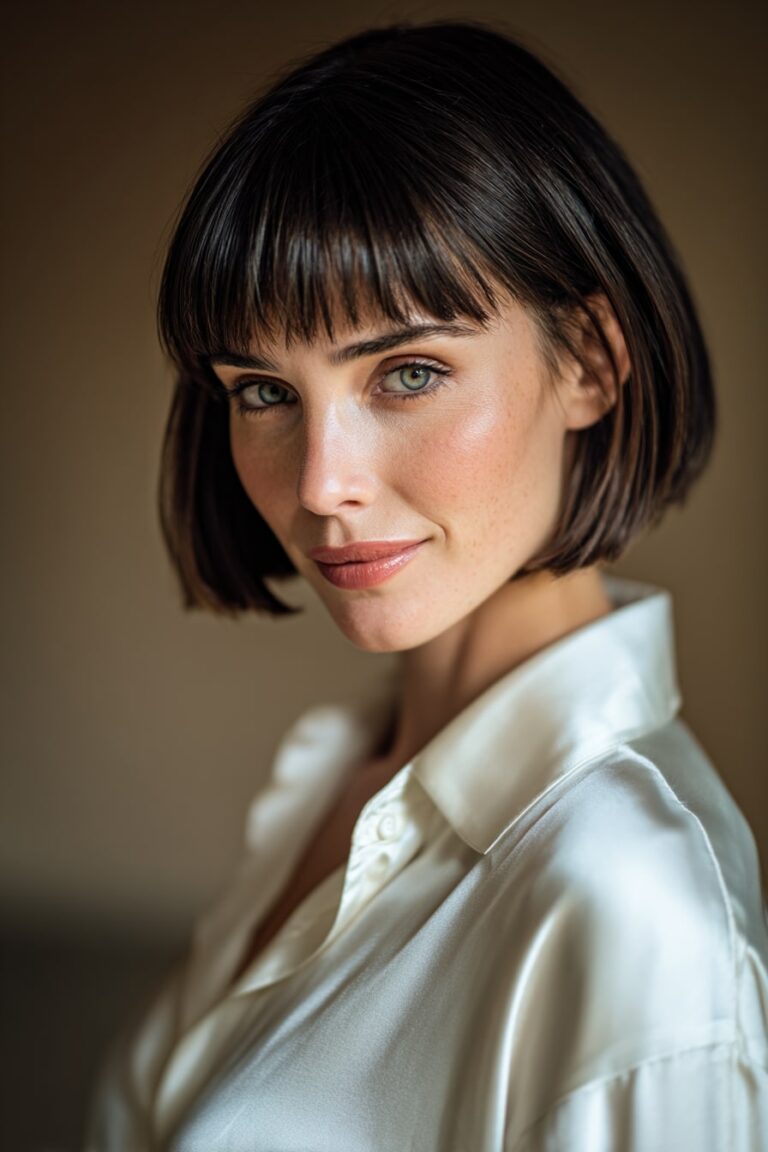 Stylish woman over 50 with a stacked bob and flowing curtain bangs, natural brown tones glowing in soft studio light.
