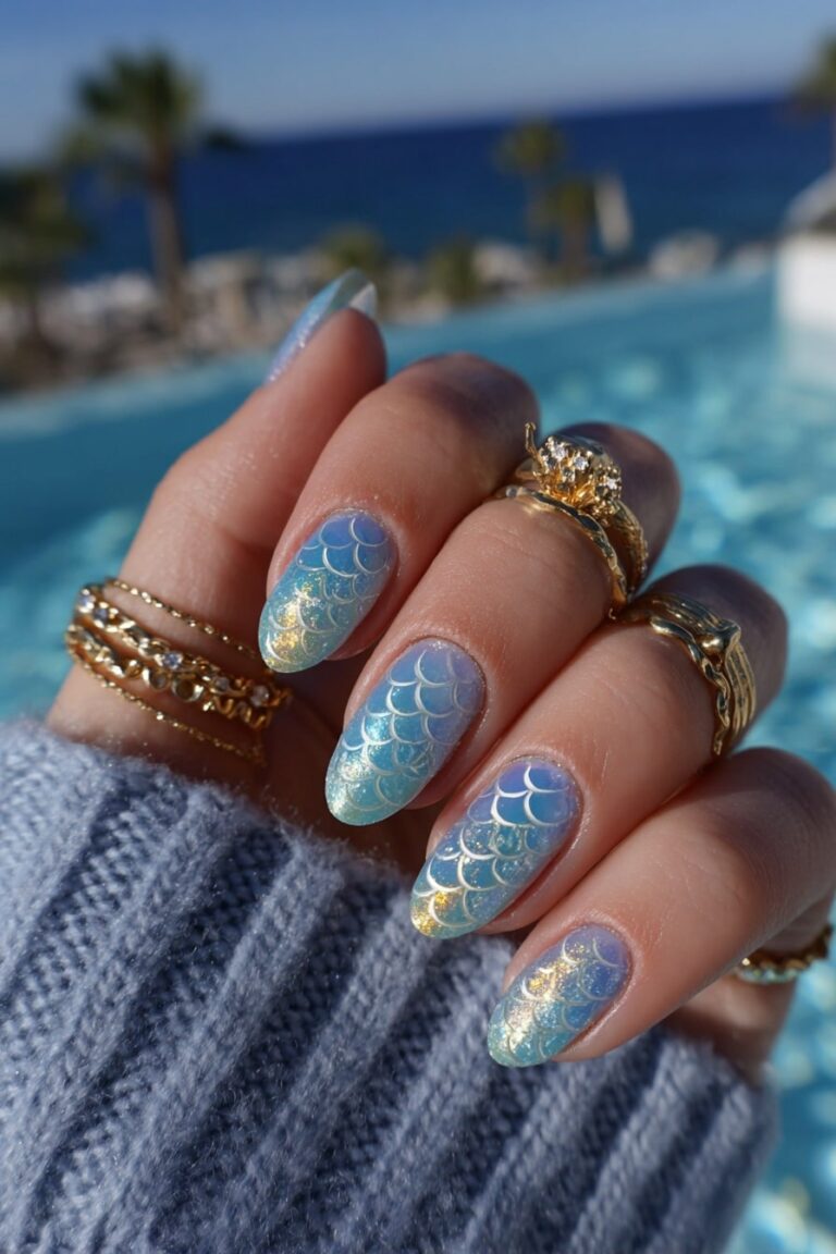 Mermaid nails are essentially the perfect vacation manicure because they’re thematically connected to beach settings. Furthermore, these designs photograph beautifully against sand and ocean backdrops, making them ideal for vacation photos.